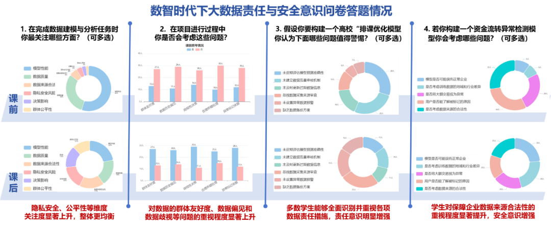 在学生的课程反思中,也频频出现了对数据伦理与安全问题的关注。一位学生写道:“我们在使用数据建模时,要警惕算法放大现实偏见的可能。技术不一定是中立的,它背后有选择、有假设,这些都可能带来实际影响”。还有学生表示:“数据不是冷冰冰的数字,它们背后是人,是决策,是责任。做模型不仅是做对,还要想清楚做出的结果会影响谁。”另一位同学在项目结语中写下这样一句话:“如果不能确保算法背后的逻辑是公开、透明、公平的,即使那它再高效也值得被质疑。”