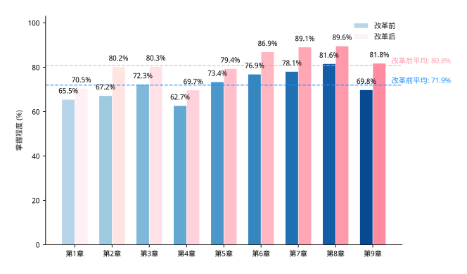 对比课程改革前后的教学效果,学生在学习行为和综合能力上表现出系统提升,“课前预习”“课堂表现”“思维能力”“课外拓展”等维度均显著提升(如图2所示)。此外,随着课程推进,学生在关键知识点的掌握与迁移能力上显著增强。课程组对每节课后知识的掌握程度进行了系统统计,发现改革后学生整体表现明显优于改革前,图中显示,改革前学生平均掌握程度为71.9%,而改革后提升至80.8%,各章节均有不同程度增长,其中第8章掌握度最高达89.6%,反映出学生对内容的掌握逐渐从“浅层记忆”向“结构理解”过渡(如图3所示)。同时,在结构建模、模型选择、字段设计等综合性题目中,学生的正确率保持增长,进一步印证了本课程对深层知识理解、分析思维能力与实践迁移能力的积极促进作用。